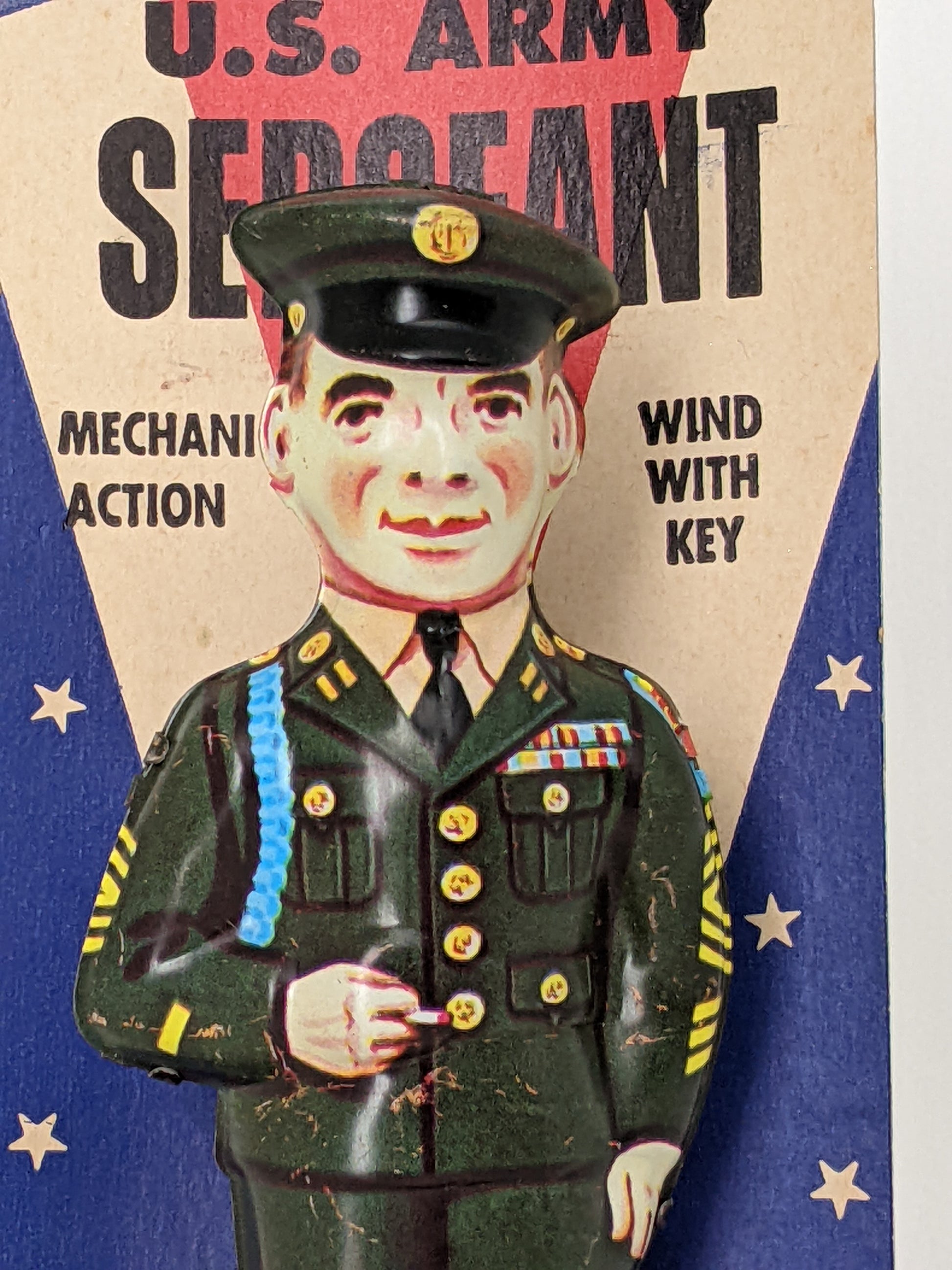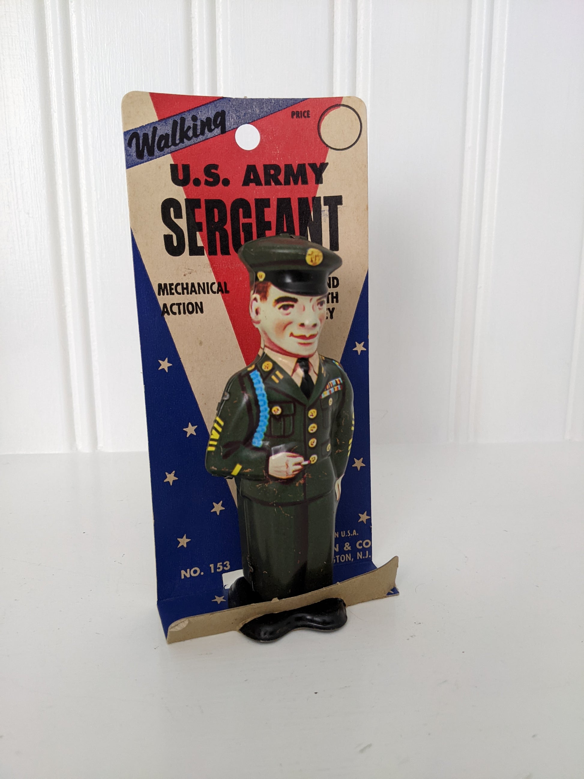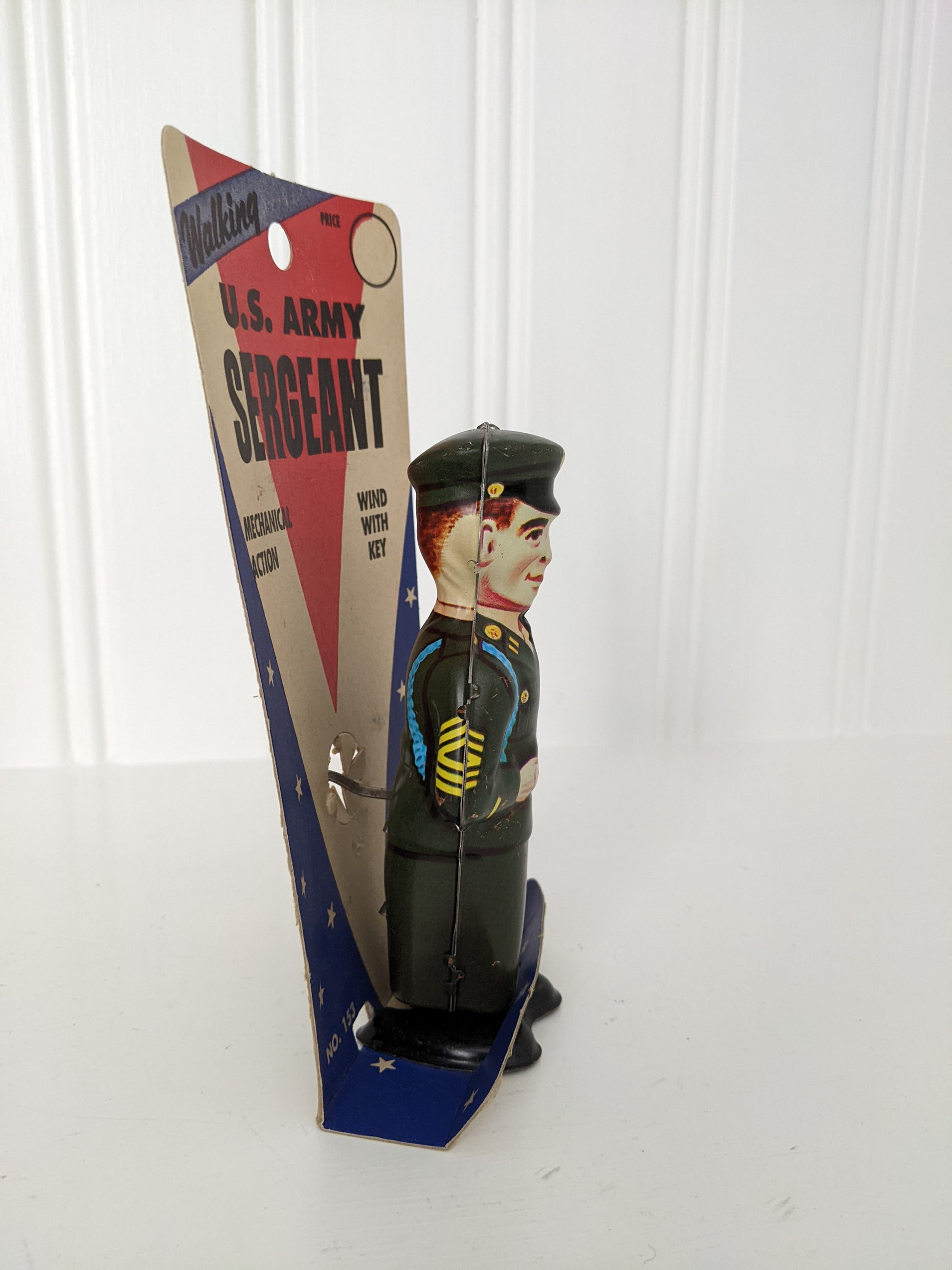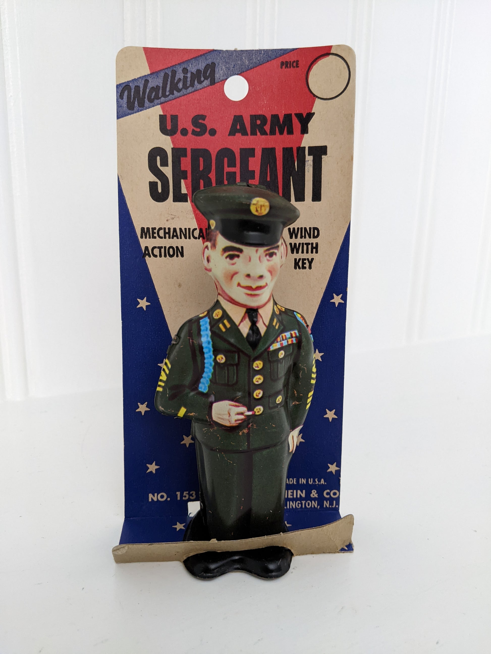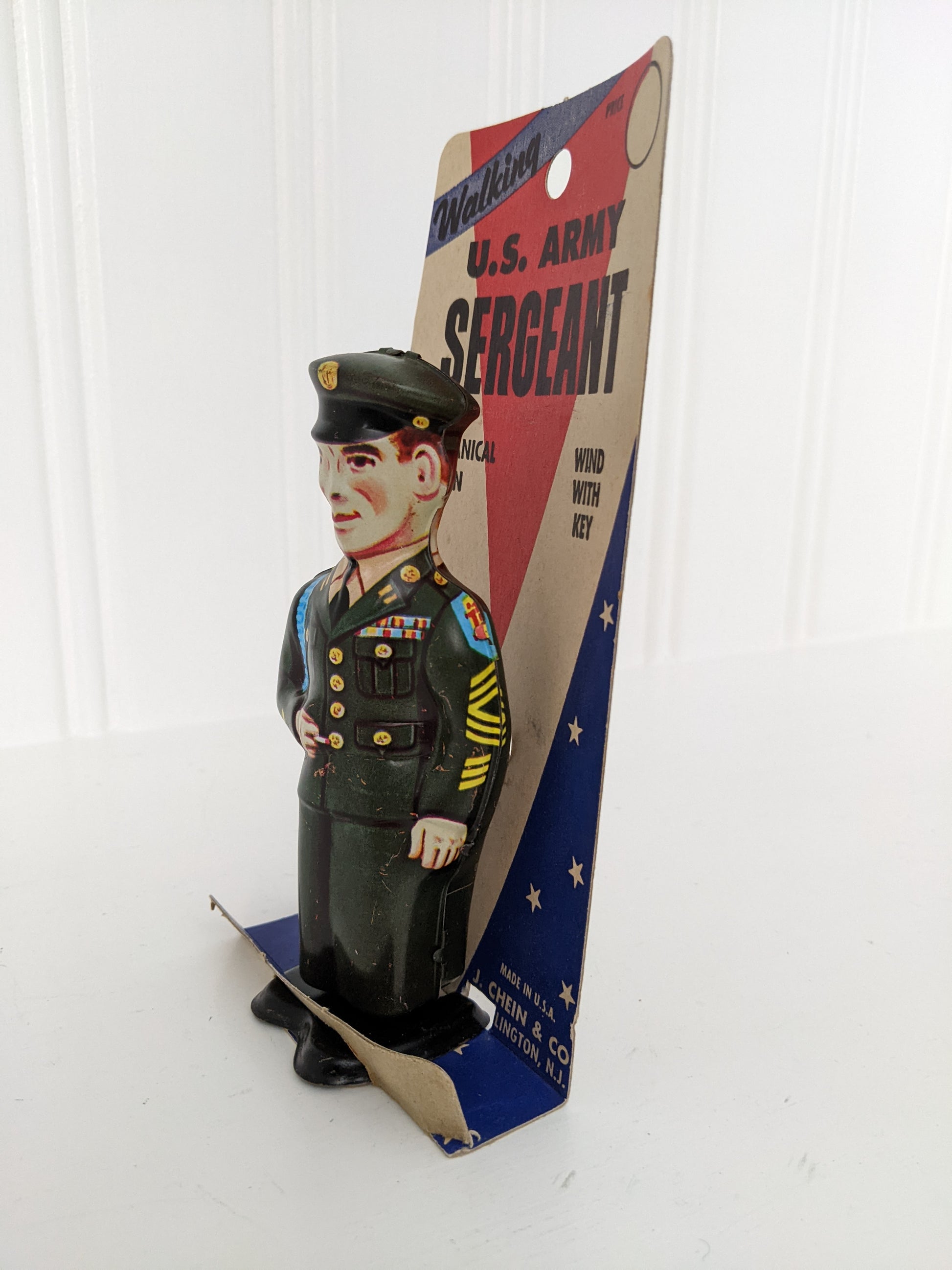 Offered for sale is this Vintage J. Chein Walking U.S. Army Sergeant Tin Wind-up Toy with its Original Card from the 1950's. This toy is untested as it is attached to its original card. Both the toy and the packaging have wear from age and storage. Makes a great display piece.