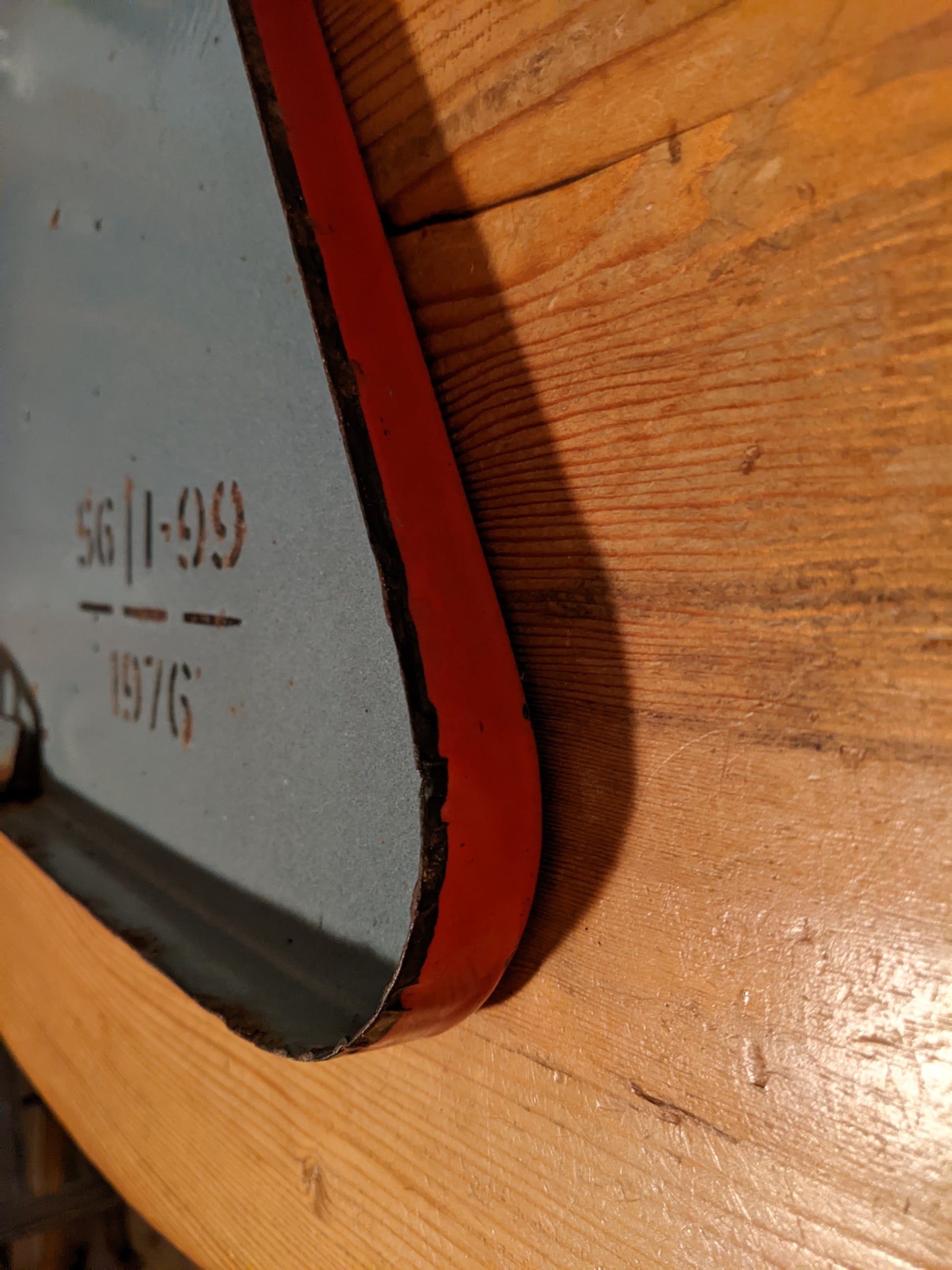 Offered for sale is this Vintage 1976 - Porcelain - Bicycle Crossing Sign European (Belgian?). The sign is in good shape with a couple of chips. One chip being right on the Cyclists head.
