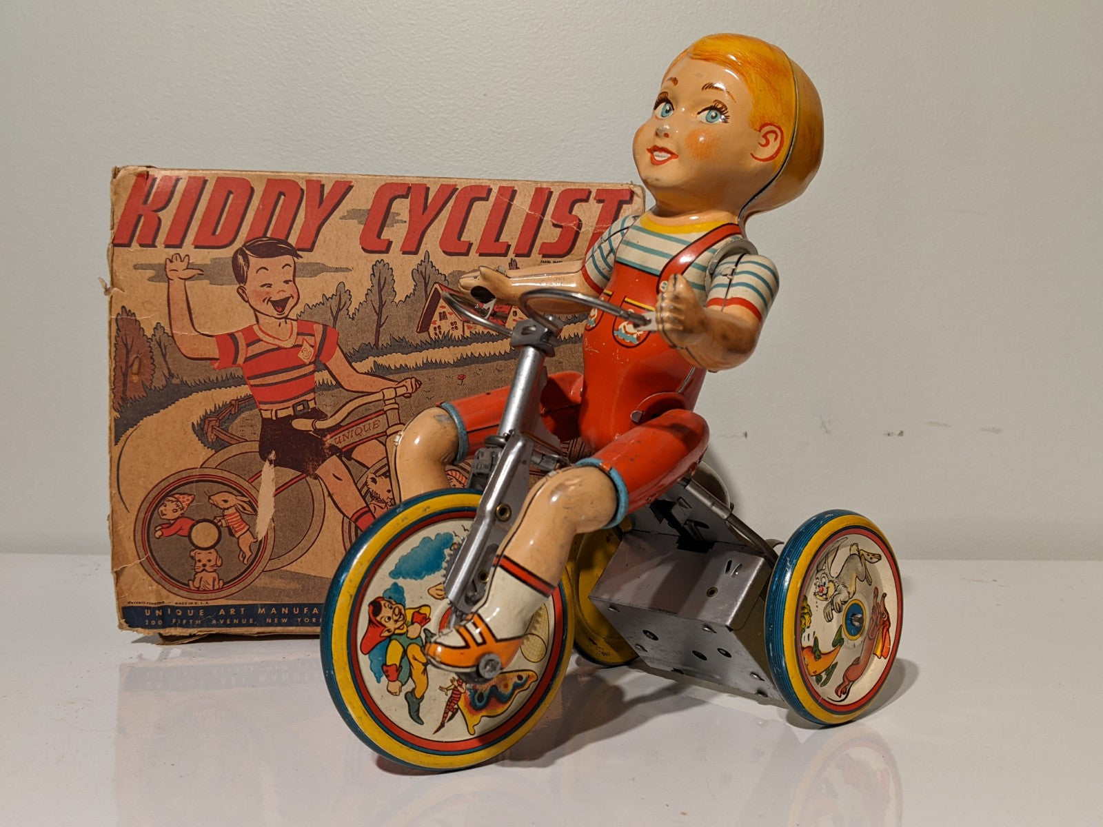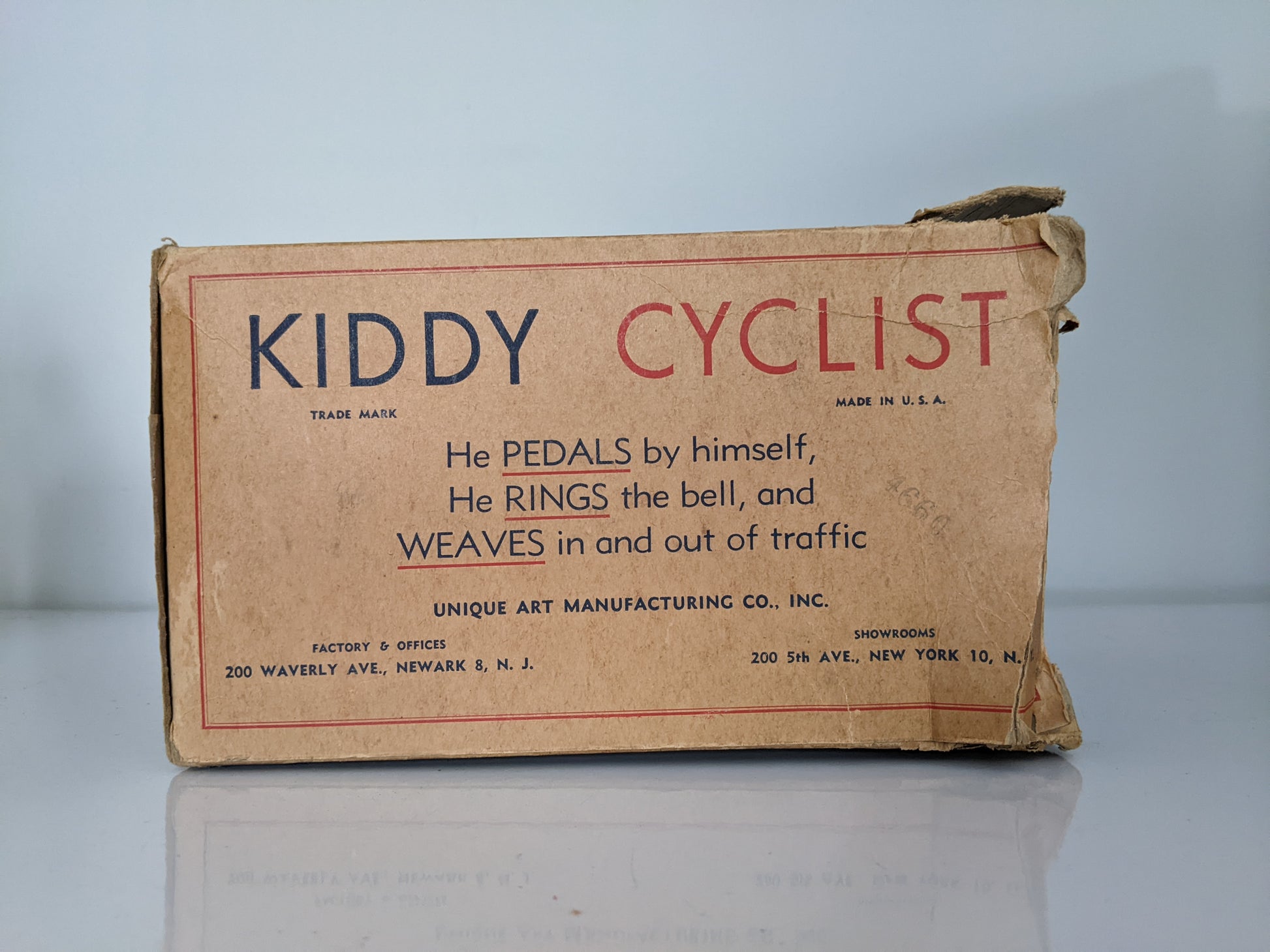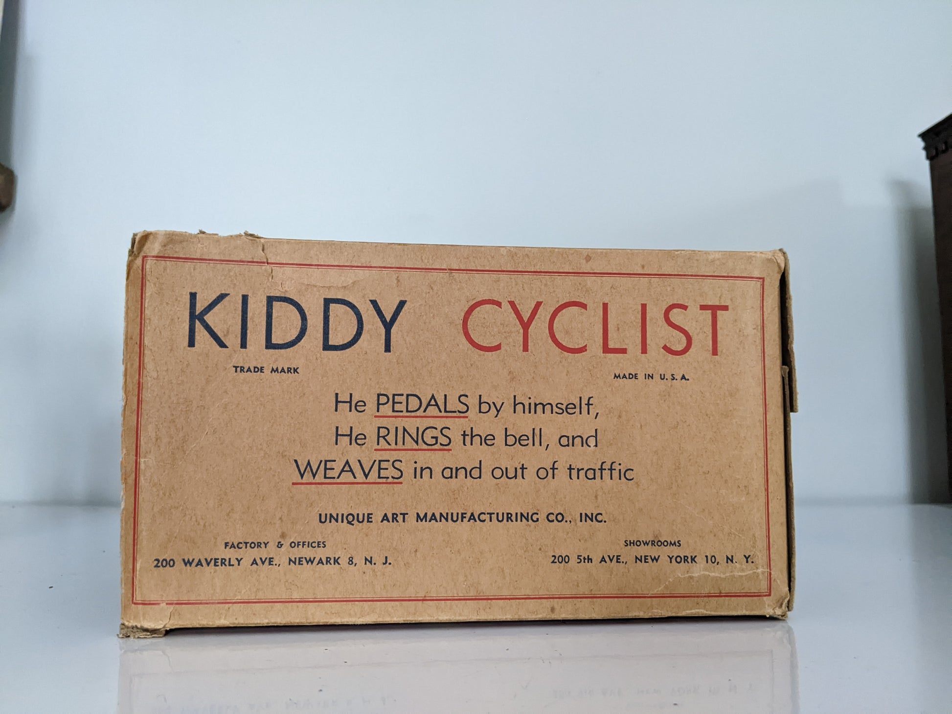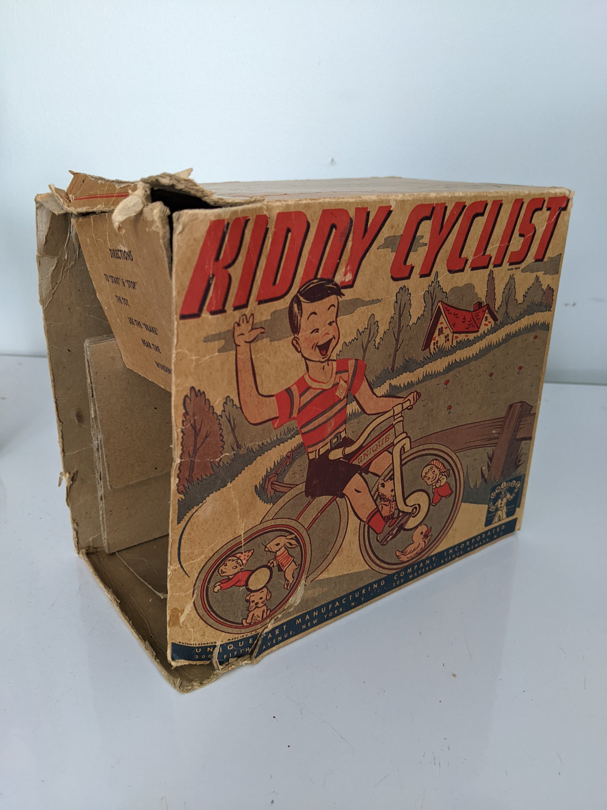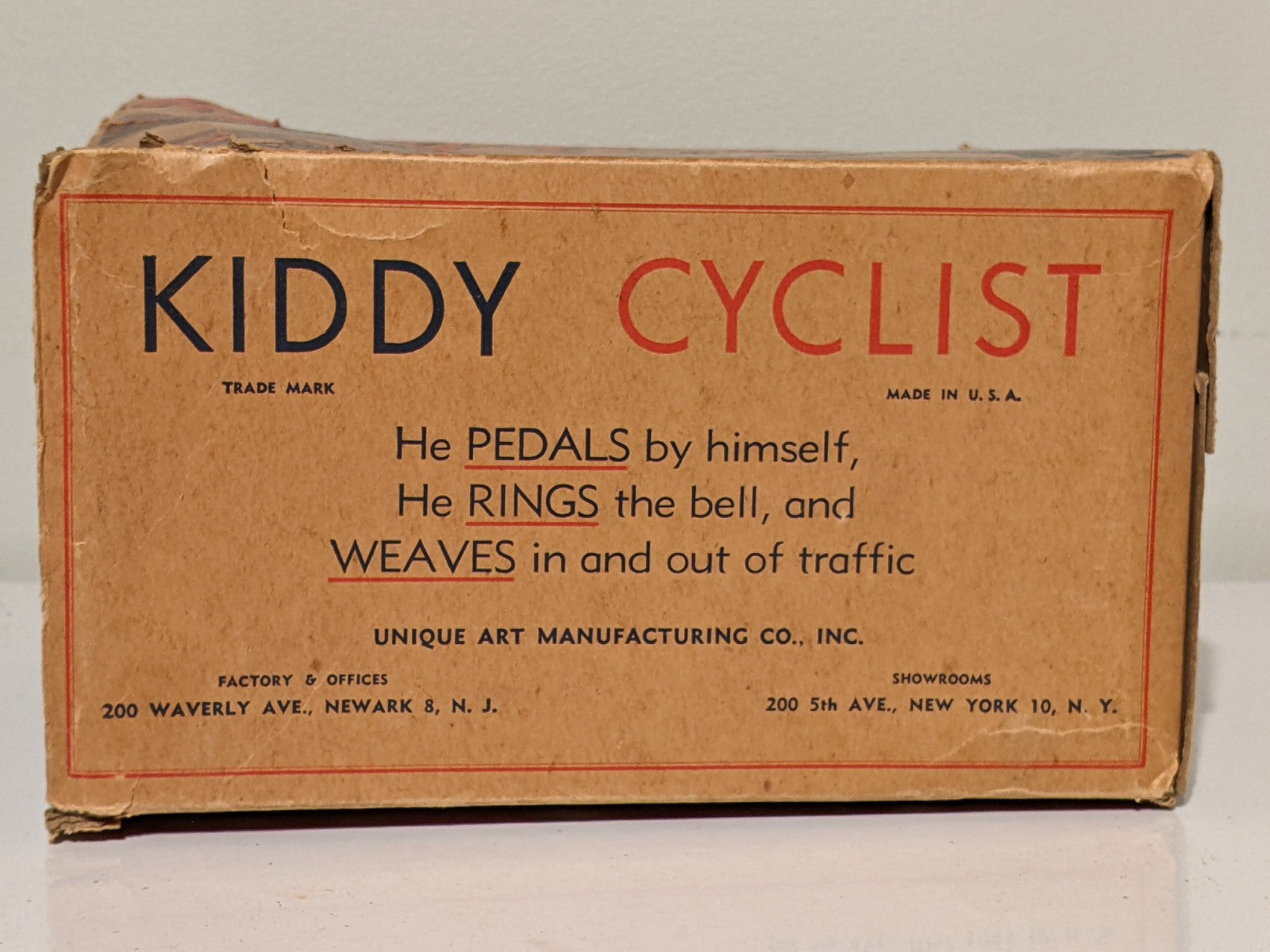 Offered for sale is this Unique Arts Kiddy Cyclist tin wind-up toy with its original box. The toy is in good shape for its age and the wind-up is working. The box is in rough shape and is missing the end flap and one smaller flap is detached.