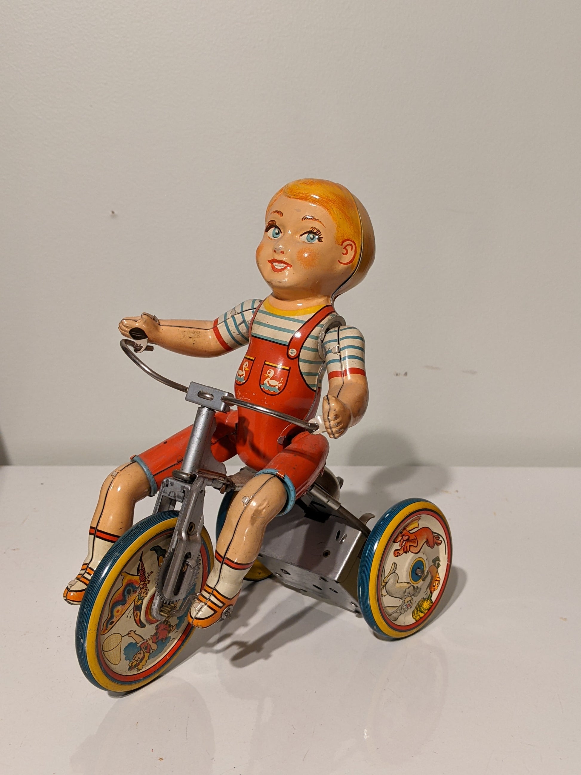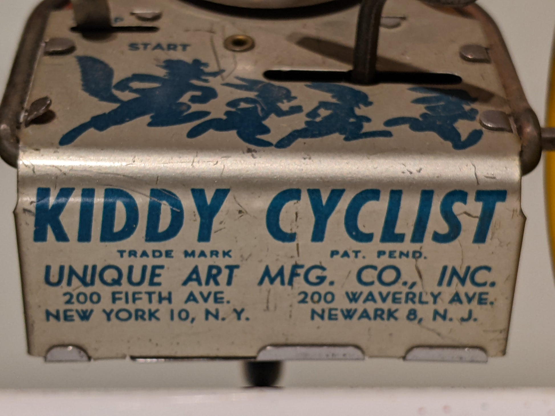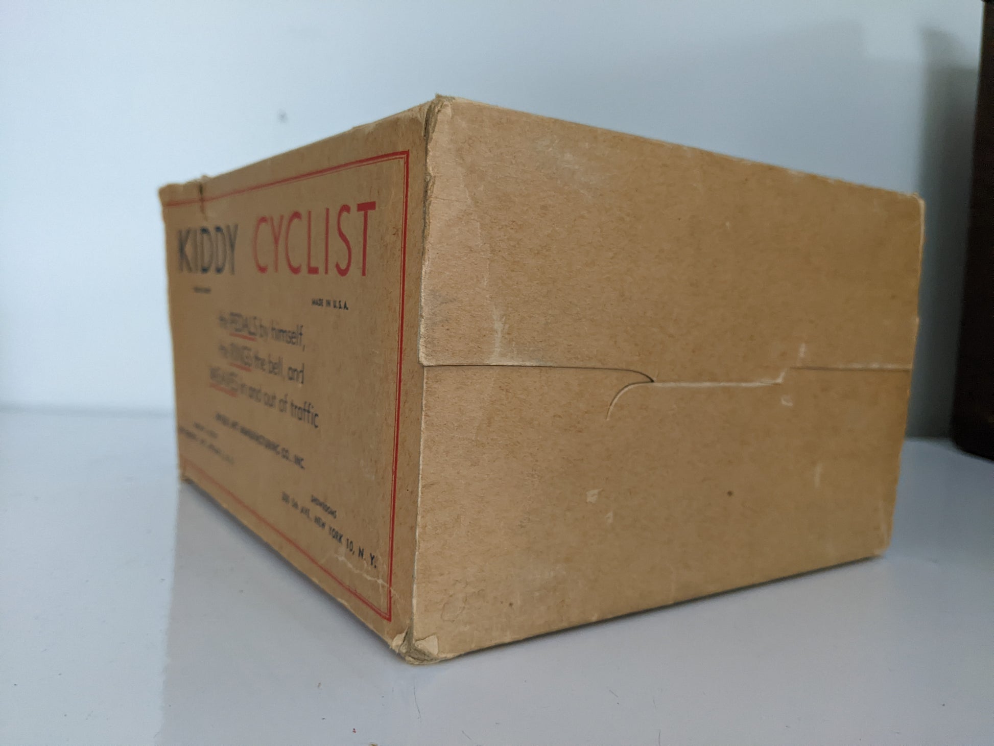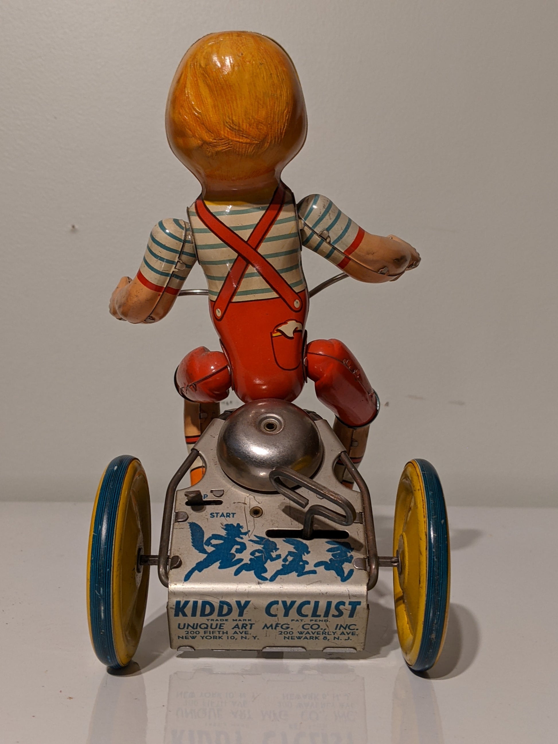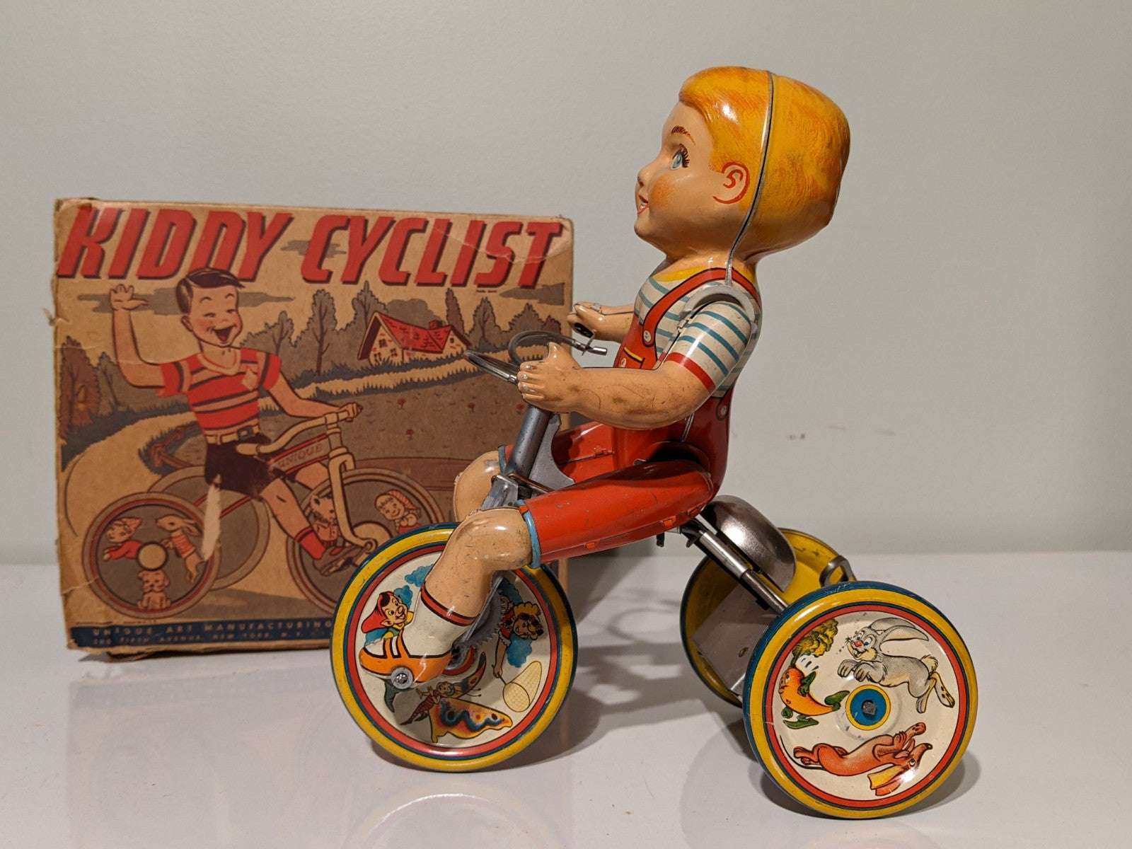 Offered for sale is this Unique Arts Kiddy Cyclist tin wind-up toy with its original box. The toy is in good shape for its age and the wind-up is working. The box is in rough shape and is missing the end flap and one smaller flap is detached.